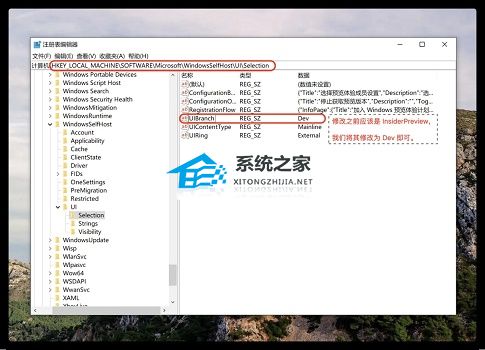 4. 进入注册表“HKEY_LOCAL_MACHINE>SOFTWARE>Microsoft>WindowsSelfHost>UI>Selection”位置。