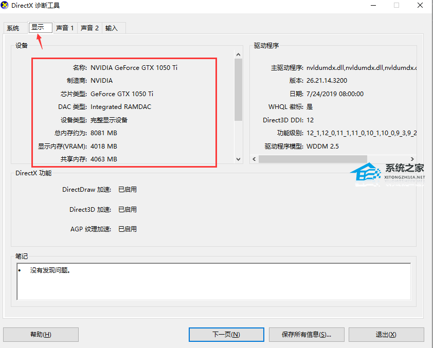 3. 切换到“显示”可以查看显卡配置(型号. GPU频率. 显存)等信息。