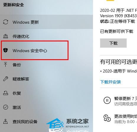 3. 点击左侧“Windows安全中心”。
