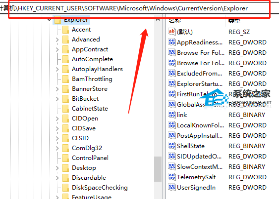2. 在打开的窗口界面中,将“HKEY_CURRENT_USERSOFTWAREMicrosoftWindowsCurrentVersionExplorer”复制粘贴到上方地址栏中并回车定位到此。