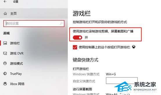 在左侧第一个“游戏栏”选项中,将右侧“使用游戏栏录制游戏剪辑、屏幕截图和广播”点击为开。