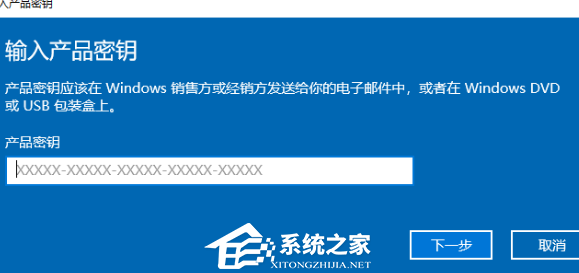 2、输入win10专业版密钥,然后点击下一步。(如果你没有密钥就无法使用这个方法)