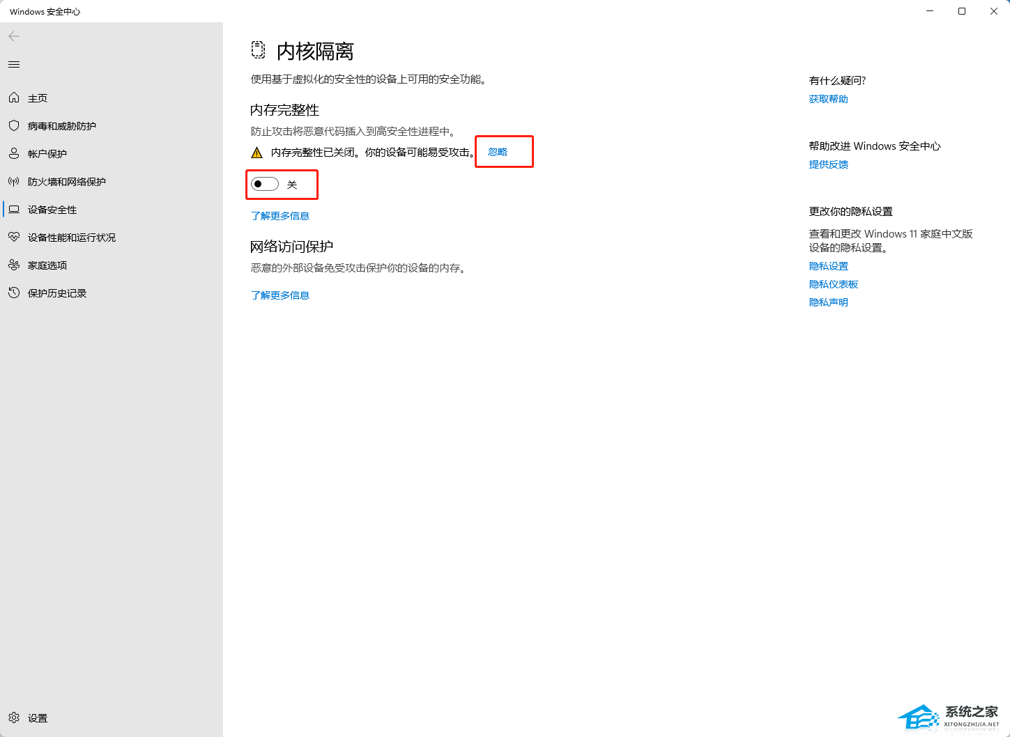 2. 将内存完整性关闭,上方提示“内存完整性已关闭。你的设备可能易受攻击。”点击后方忽略即可,不会对使用有影响。