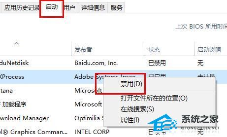 6. 这时我们选中“启动”选项,右击“状态”显示为“已启动”的项,选中“禁用”功能。
