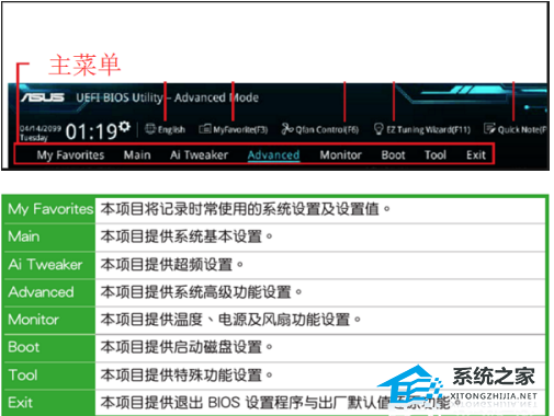 高级模式有MY Favorites,Main,Boot,Tool等八个主菜单,详情如下图所示。