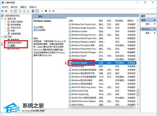2. 选择“服务和应用程序->服务”、然后找到“Windows Update”双击打开 (这里是用名称排序的,从W开始找比较快。)
