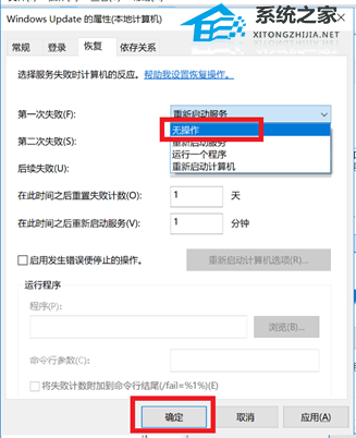 4. 点击“恢复”选项卡,将“第一次失败”、“第二次失败”、“后续失败”都改为“无操作”,然后点击“确定”(这步非常重要,否则自动更新还会自动开启。