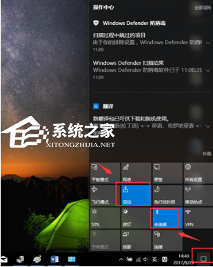 从桌面右下角点击‘操作中心’,单击‘蓝牙’和‘定位’既可实现关闭功能。