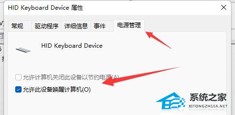 4. 打开后,进入“电源管理”,勾选“允许此设备唤醒计算机”并保存。