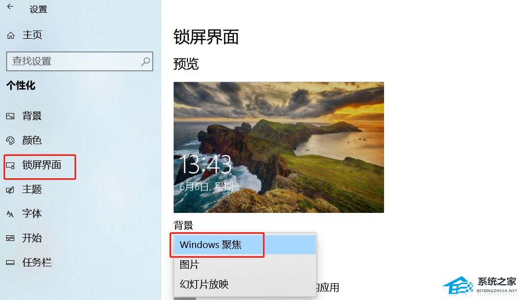 重新进入设置——个性化——锁屏界面,将锁屏选项更改为Windows聚焦,如下图分别为win11和win10。