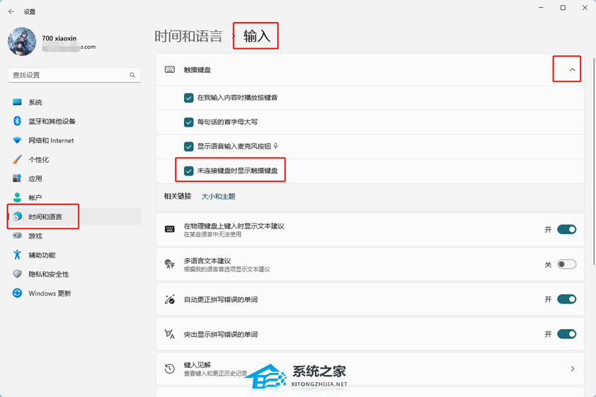 开始菜单——设置——时间和语言——输入——展开触摸键盘。