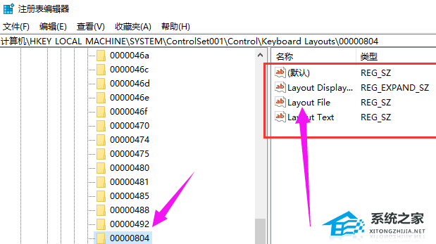 2. 打开注册表,在弹出的注册表编辑器上找到“HKEY_LOCAL_MACHINE\ SYSTEM\ControlSet001\Control\Keyboard Layouts”仔细检查会发现以“0804”结尾的都是简体中文输入法。