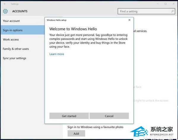 4. 下一个屏幕将为您提供Windows Hello的一些背景信息,单击Getstarted(开始),下一步可能会以极快的速度完成,定位自己,使您的面部位于屏幕上显示的框架的中心,摄像头将执行必须执行的操作以注册您的面部。