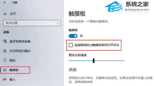 2. 找到左侧“触摸板”,取消勾选“连接鼠标时让触摸板保持打开状态”即可。