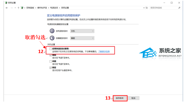 11. 在关机设置里取消勾选[启动快速启动],点击[保存修改],如下图所示,就可以完成通过BIOS RTC设置自动开机。