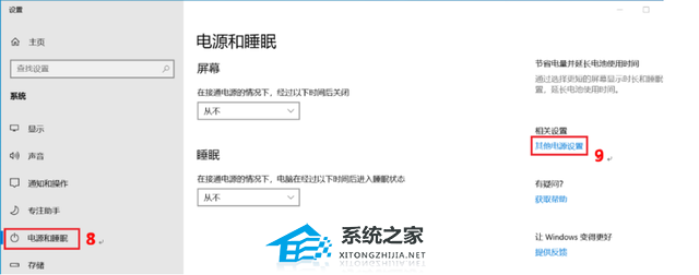 8. 在[电源和睡眠]设定页面的点击[其他电源设置],如下图所示: