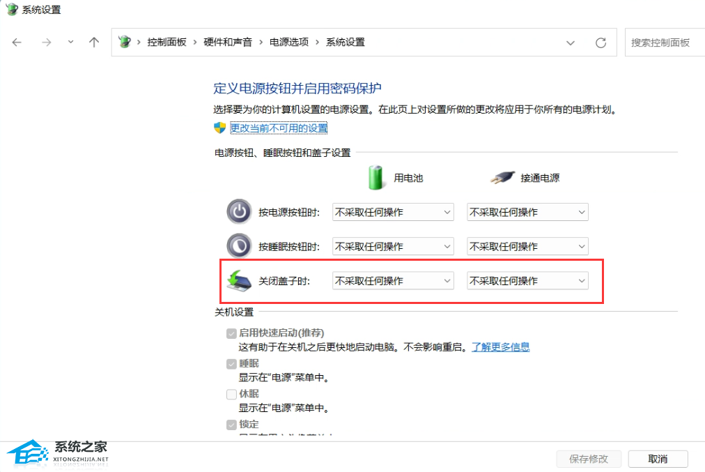 4. 最后修改关闭盖子时应该执行的操作后点击保存就OK了。