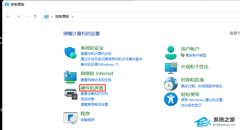 2. 在控制面板里点击硬件和声音(注意右上角查看模式为类别,才可以看到硬件和声音选项)。