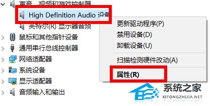 4. 在下拉中右击选择你的声卡设备,然后点击“属性”。