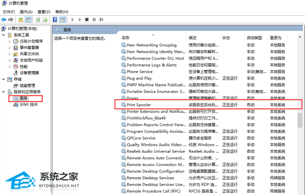 5. 进入到“管理”界面后,点击左侧栏“服务和应用程序”中的“服务”,然后找到右侧中的“Print spooler ”,右击将其“停止”。