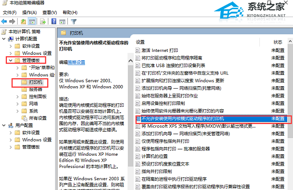 2. 进入到组策略编辑器后,依次点击左侧栏中的“计算机配置——管理模板——打印机”,找到右侧中的“不允许安装使用内核模式驱动程序的打印机”双击打开。