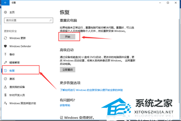 在菜单栏 打开“设置”->“更新和安全”->“恢复”->“重置此电脑” ->“开始”,然后根据自己的需要进行系统重置。