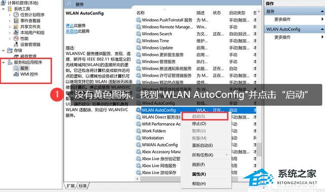 3. 若无黄色图标,展开【服务和应用程序】,单击【服务】,找到【WLAN AutoConfig】,单击右键选择【启动】。