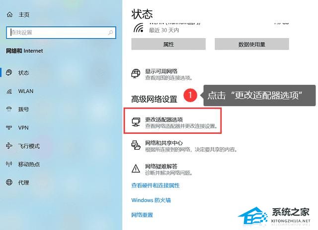 1. 打开【设置】,点击【网络和Internet】,找到【更改适配器选项】;