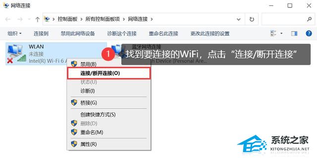 2. 进入后找到要连接的网络,单击右键选择【连接/断开连接】。