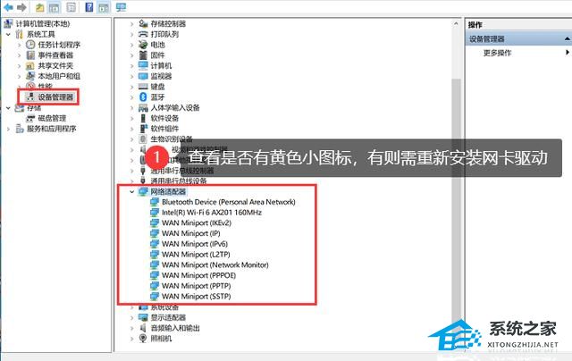2. 在【设备管理器】中查看是否有黄色图标,若有黄色图标,则需要重新安装网卡驱动。