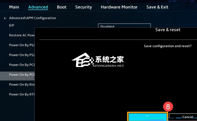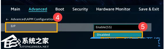 1. 关机后,按住【Del】或【F2】键开机进入BIOS,在高级模式中,点击【Advanced】,然后选择【APM Configuration】。