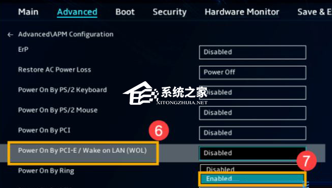 3. 将【Power On By PCI-E / Wake on LAN (WOL)】设置为【Enabled】。