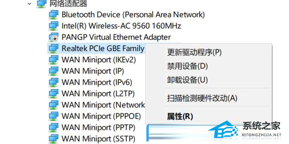 2. 点击【网络适配器】设备左边的箭头,右键当前的【有线网络设备】,在打开的菜单项中,选择【属性】。