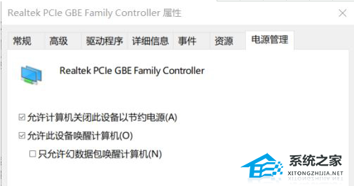 3. 切换到【电源管理】选项卡,勾选【允许此设备唤醒计算机】,然后点击【确定】即可。