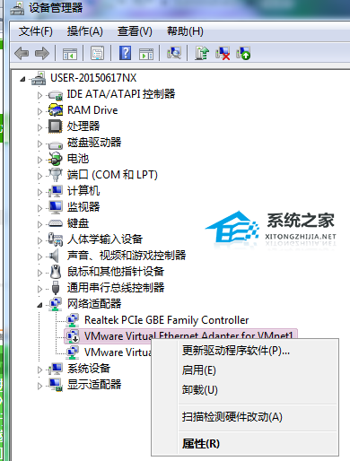 3. 打开后,右键网络适配器下的网卡,选择“更新驱动程序软件”