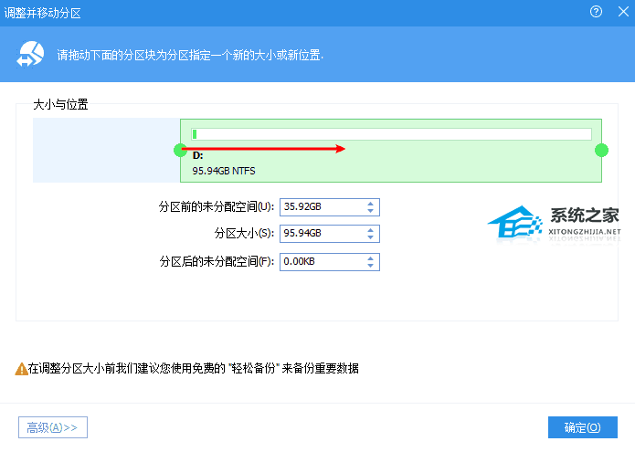 2. 拖动绿色条两侧的圆圈以确定未分配空间的大小。单击“确定”继续。