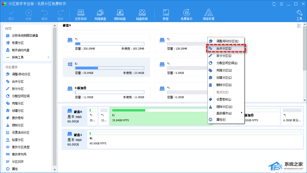 3. 现在,您可以看到磁盘上有一块未分配的空间。右击C盘,选择“合并分区”。