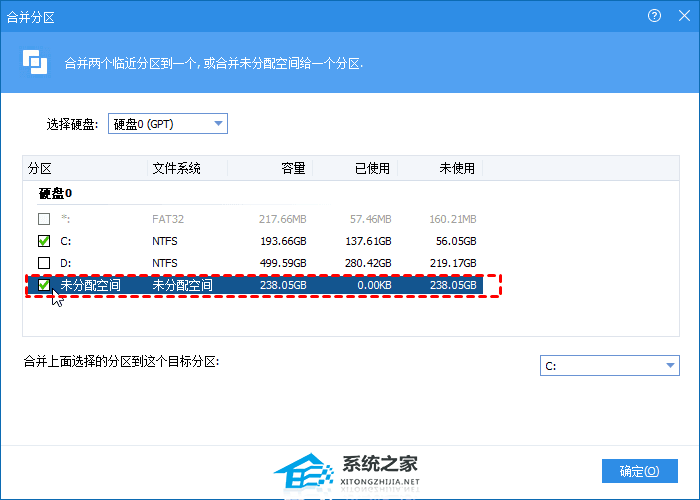4. 勾选您刚刚创建的未分配空间,然后点击“确定”。