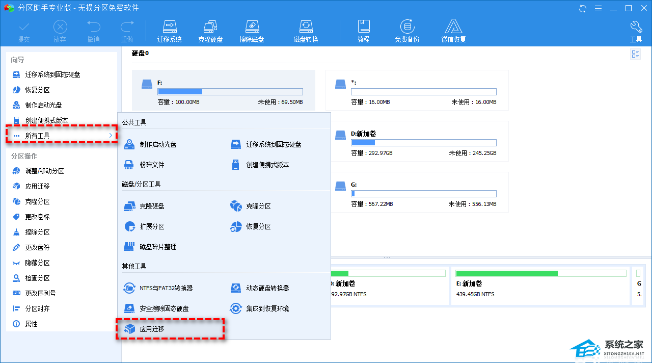1. 安装并运行傲梅分区助手,在主界面中依次单击所有工具 > 应用迁移。