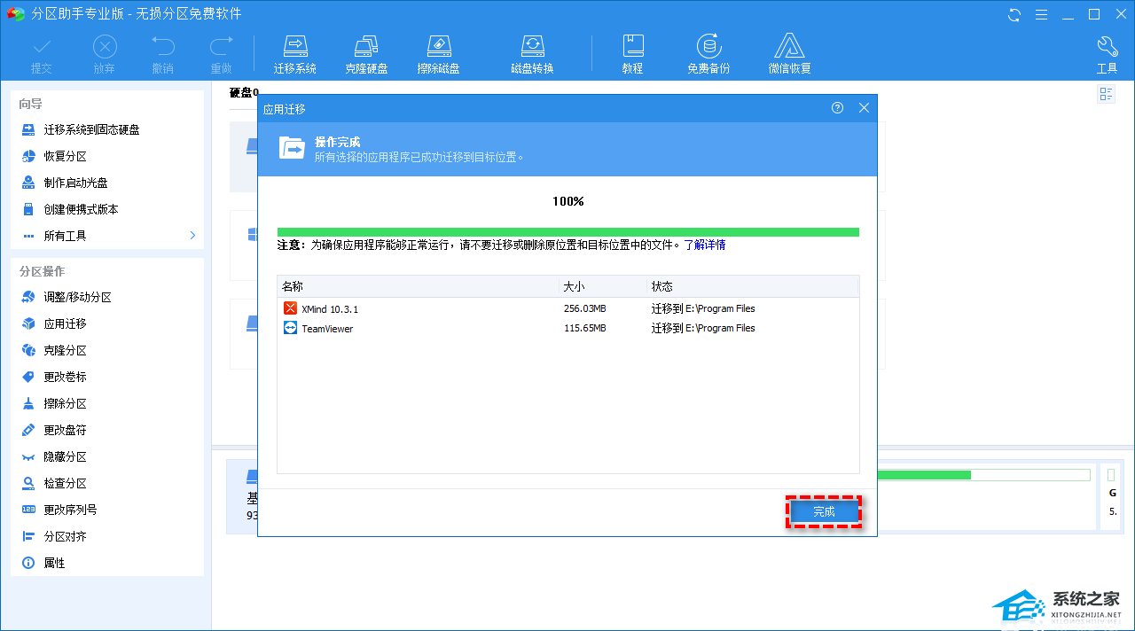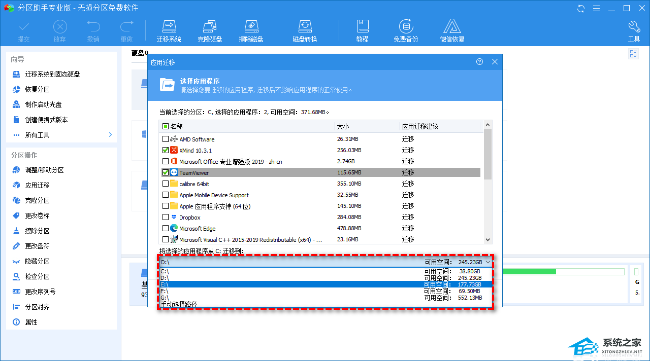 3. 这里将列出C盘上的所有可移动应用程序。选择您需要移动的一个或多个应用程序和目标分区。然后点击迁移。