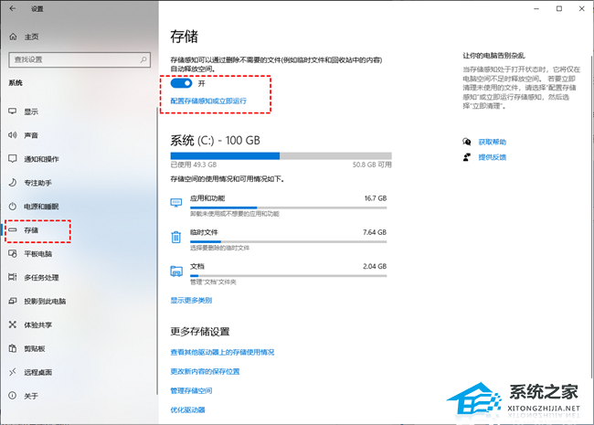 注意:打开存储感知后,它只在您的电脑空间不足时才会运行。要立即清理垃圾文件,请选择“配置存储感知或立即运行”并点击“立即清理”。