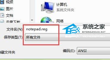 4. 并且命名为“notepad.reg”保存的类型选择为“所有文件”点击保存。
