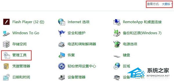 2. 将右上角“查看方式”更改为“大图标”,选择“管理工具”。