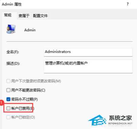 8. 最后在打开的窗口中,取消【账户已禁用】勾选,重启电脑即可正常使用。