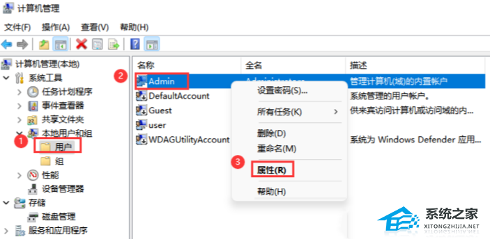 7. 计算机管理窗口,左侧点击【用户】,右侧选择被停用的用户,右键选择【属性】;