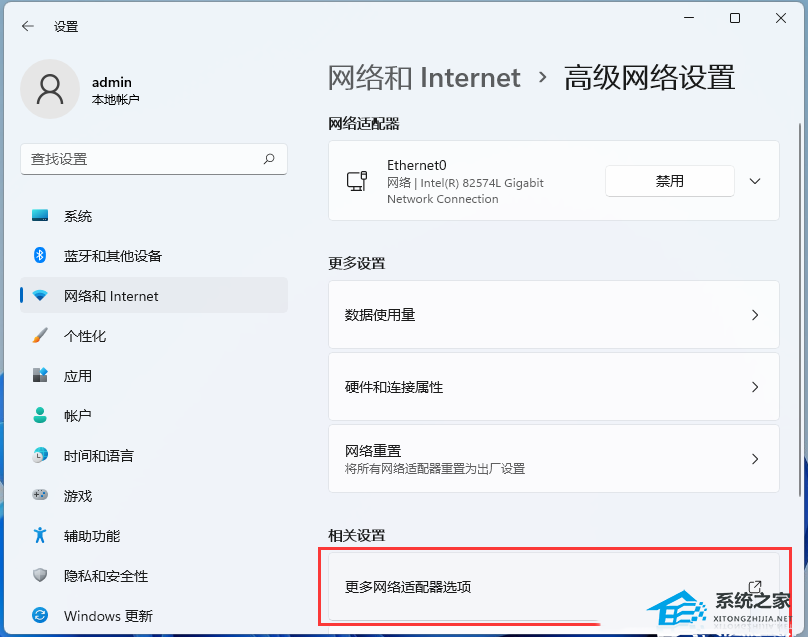 3. 相关设置下,点击【更多网络适配器选项】;