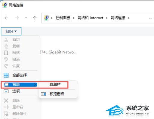 4. 网络连接窗口,点击【组织】,在打开的下拉项中,选择【布局】,然后勾选【菜单栏】;