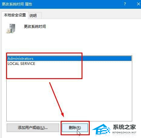 4. 在右侧双击打开“更改系统时间”,在框中选中用户名,点击删除,点击应用并确定即可完成设置。