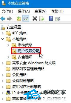 3. 在左侧点击“本地策略”—“用户权限分配”。