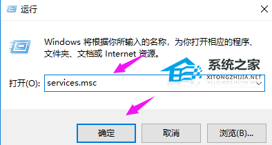 1. “win+R”快捷键开启运行,输入“services.msc”,点击确定打开。